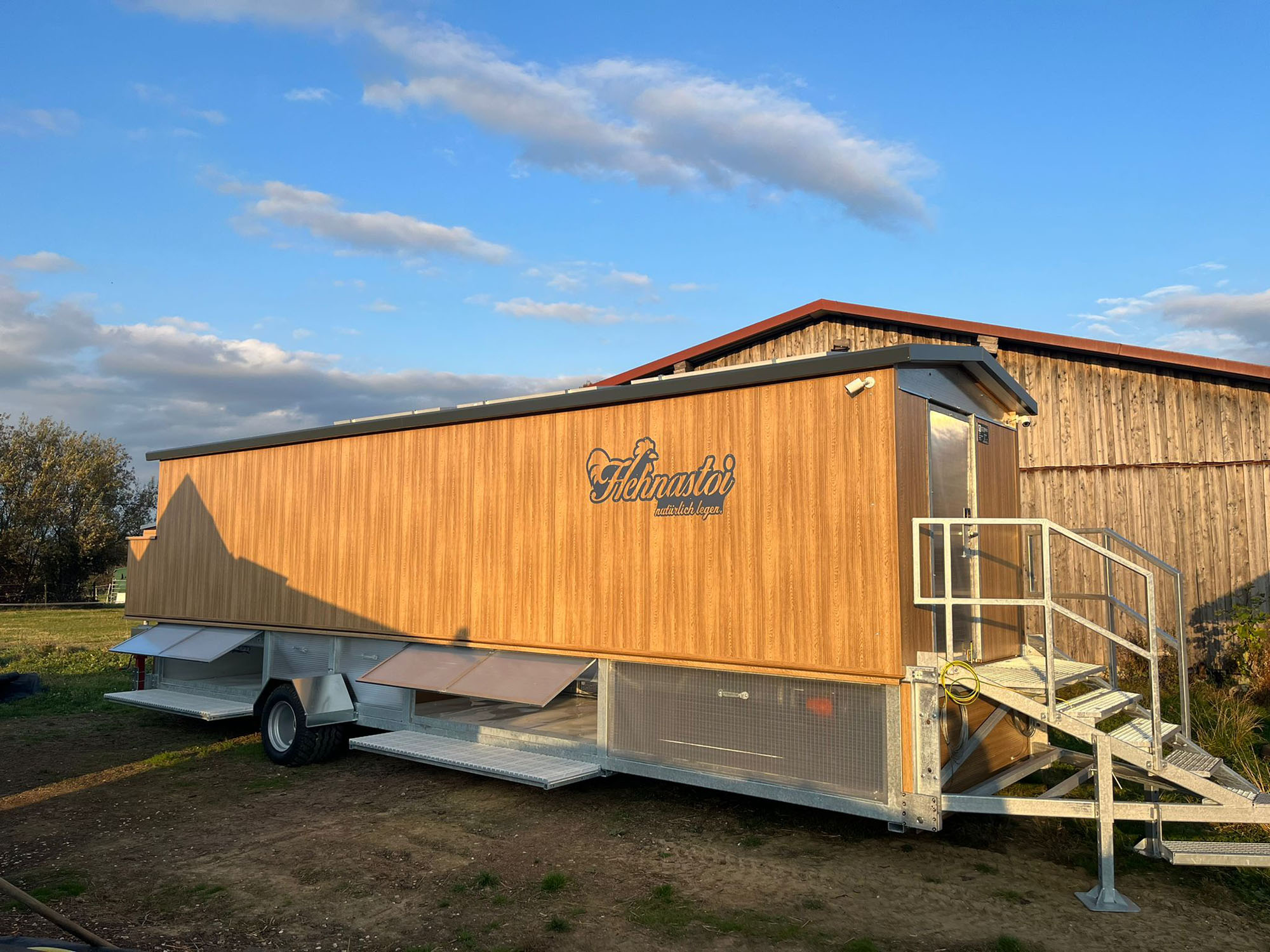 In den fahrbaren Hühnerställen finden bis zu 620 Tiere Platz. Das Hennen-Wohnmobil überzeugt durch umfangreiche Ausstattungsvarianten. Je nach Wetterlage ziehen die Hühner mittels Traktor einmal die Woche um. Das schont das Grünland, die Hühner sind durch die artgerechte Haltung nachweislich gesünder und legen deutlich besser und länger. An die frische Luft gelangen die Tiere über zeitgesteuerte Auslaufklappen, im Innenbereich finden sie ihre Legenester, Sitzstangen, einen Scharrraum und Futter für bis zu zwei Wochen.