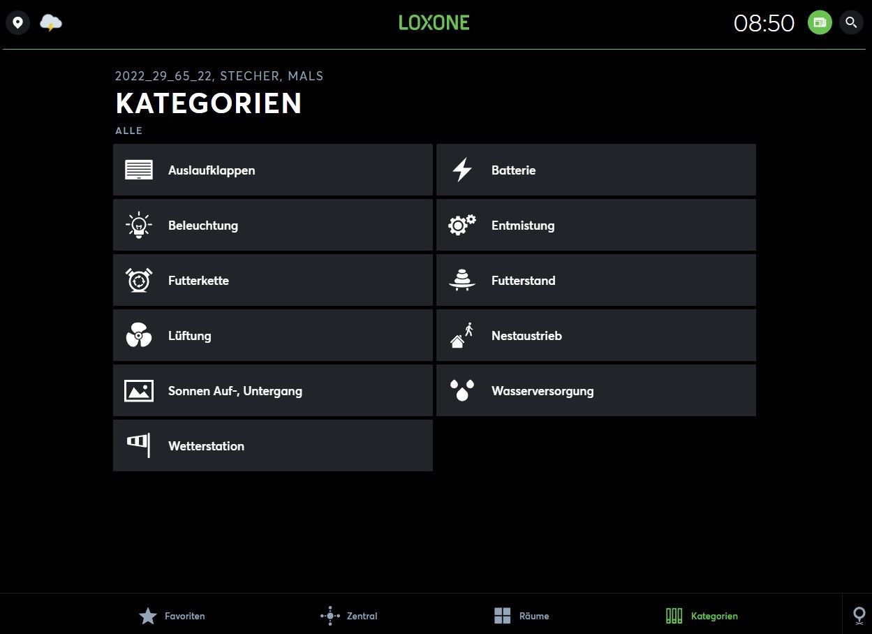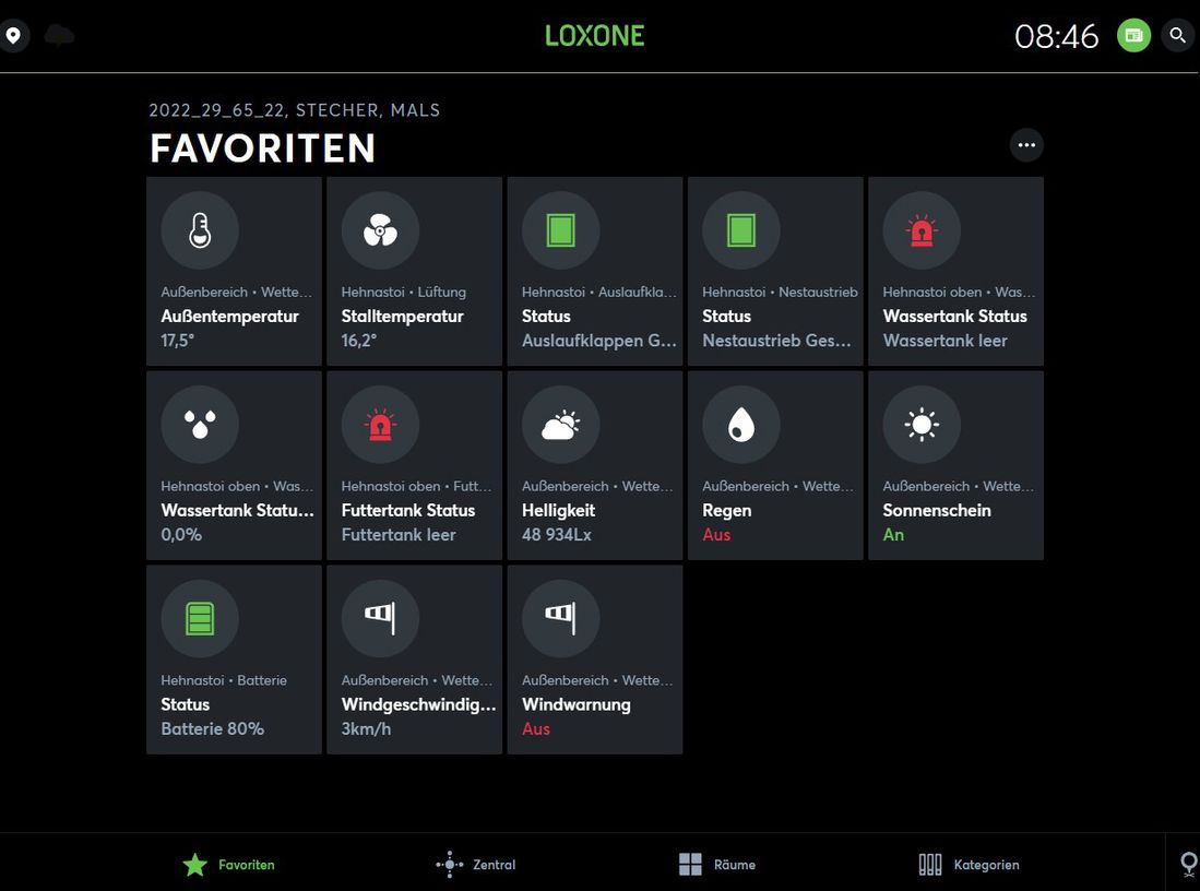 Der Zugriff auf die Steuerung ist via Smartphone, Tablet oder PC möglich und kann durch die eingebaute SIM-Karte auch aus der Ferne über einen Online-Zugang erfolgen. Die gesamte Technik ist in einem einzigen Steuerschrank untergebracht. Das Hauptmenü verschafft Ihnen einen kompakten Überblick über sämtliche Funktionen des mobilen Hühnerstalls, in den jeweiligen Unterkategorien des Menüs können die Einstellungen geändert werden.
